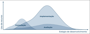 O estágio de implementação é quando um conjunto de ações são postas em prática para viabilizar o alcance dos resultados almejados, englobando a estruturação da Governança e Gestão; a operacionalização dos instrumentos constitucionais de Planejamento (PPA, LDO e LOA); as atividades de operação e monitoramento; etc.