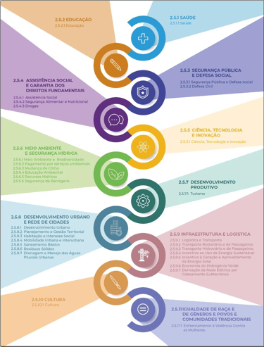 Nesse contexto, com base no PDI Bahia 2035, perpassando os três estágios do ciclo de uma política, buscou analisar a estrutura de governança estadual de 29 políticas públicas, relacionadas a 11 Eixos Estratégicos, conforme figura a seguir: